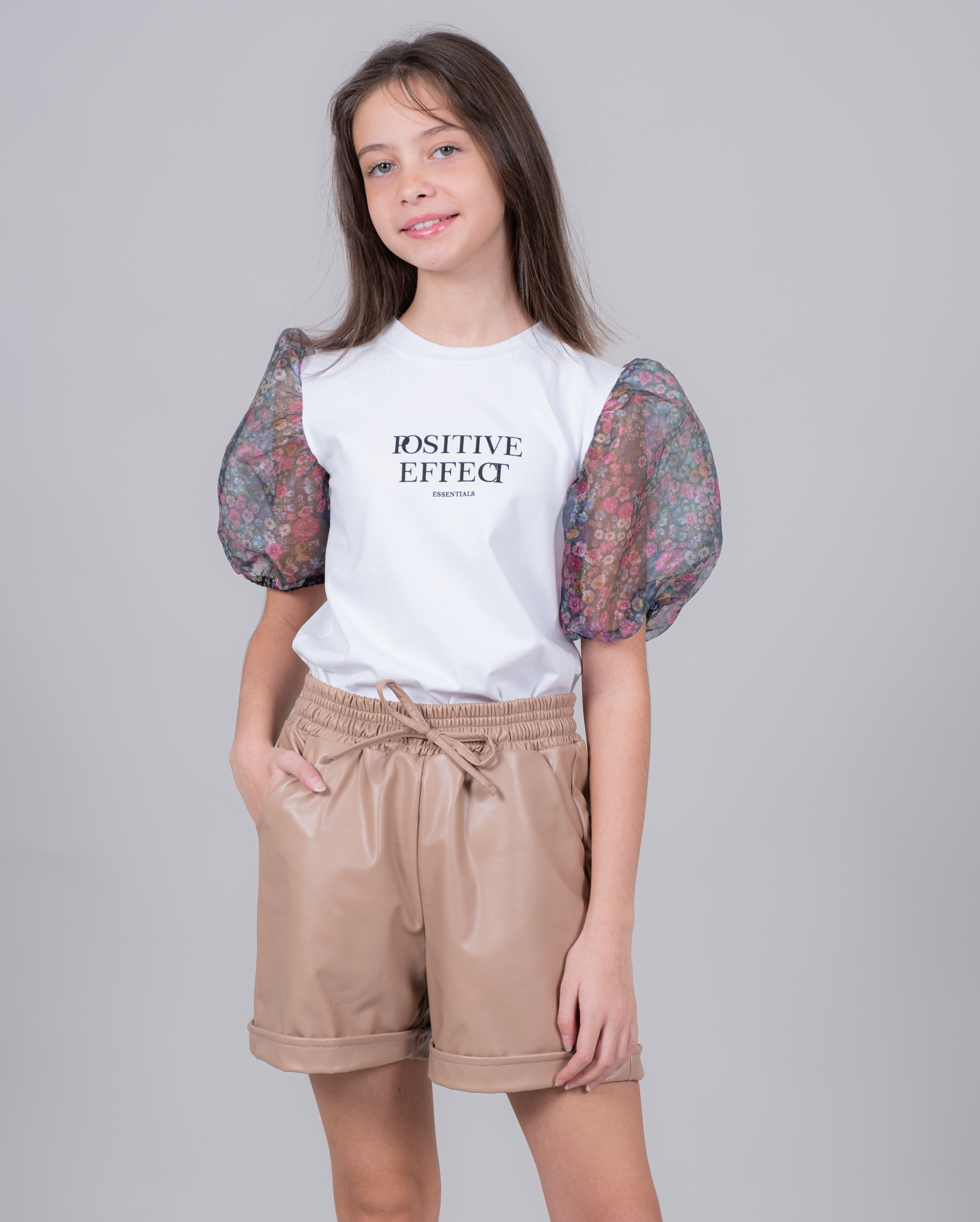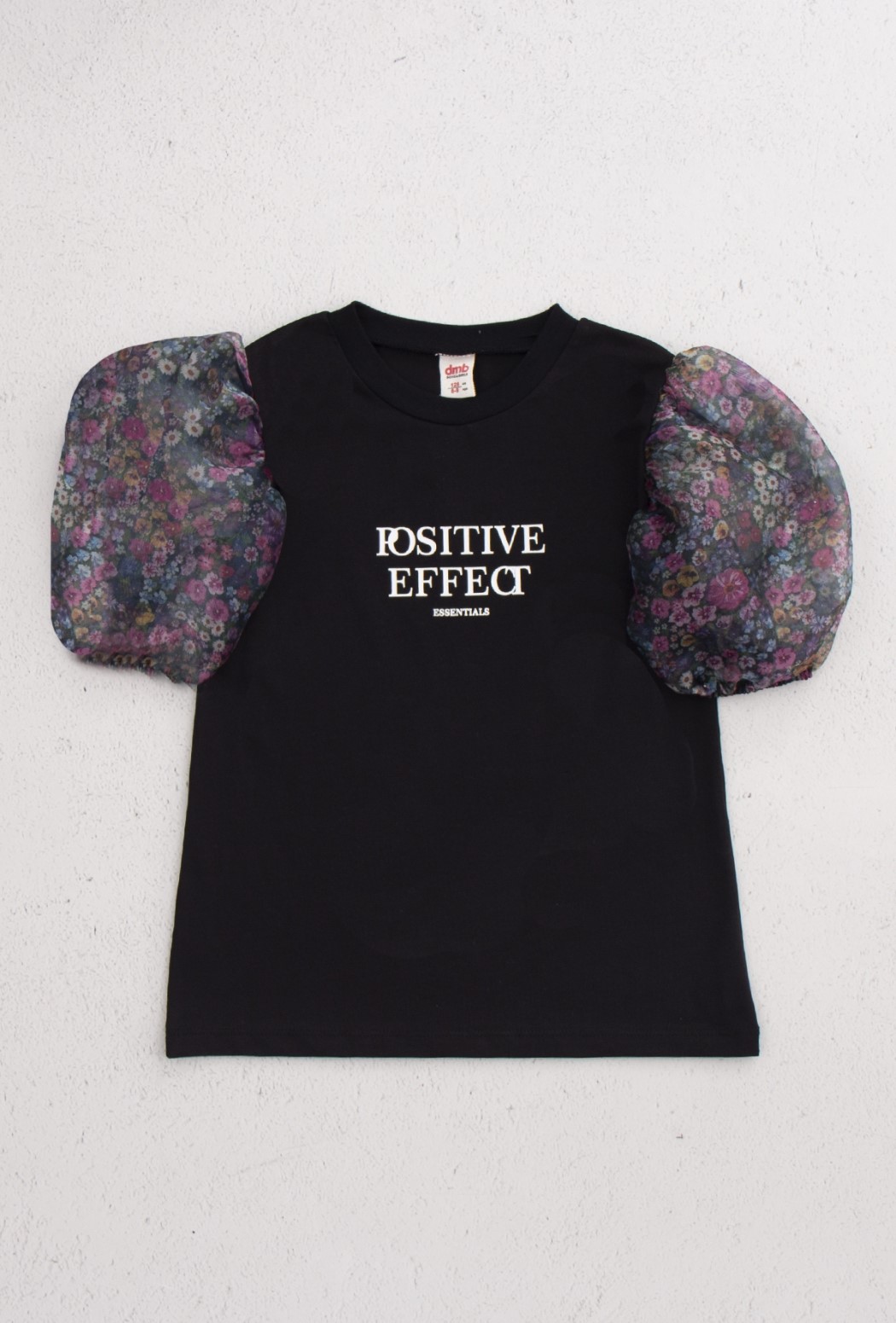 Однотонная блузка с контрастным принтом выполнена из мягкого хлопкового трикотажа, рукава – из полупрозрачной органзы в цветочек. Прямой крой, круглый вырез горловины, короткие рукава-фонарики на резинке.