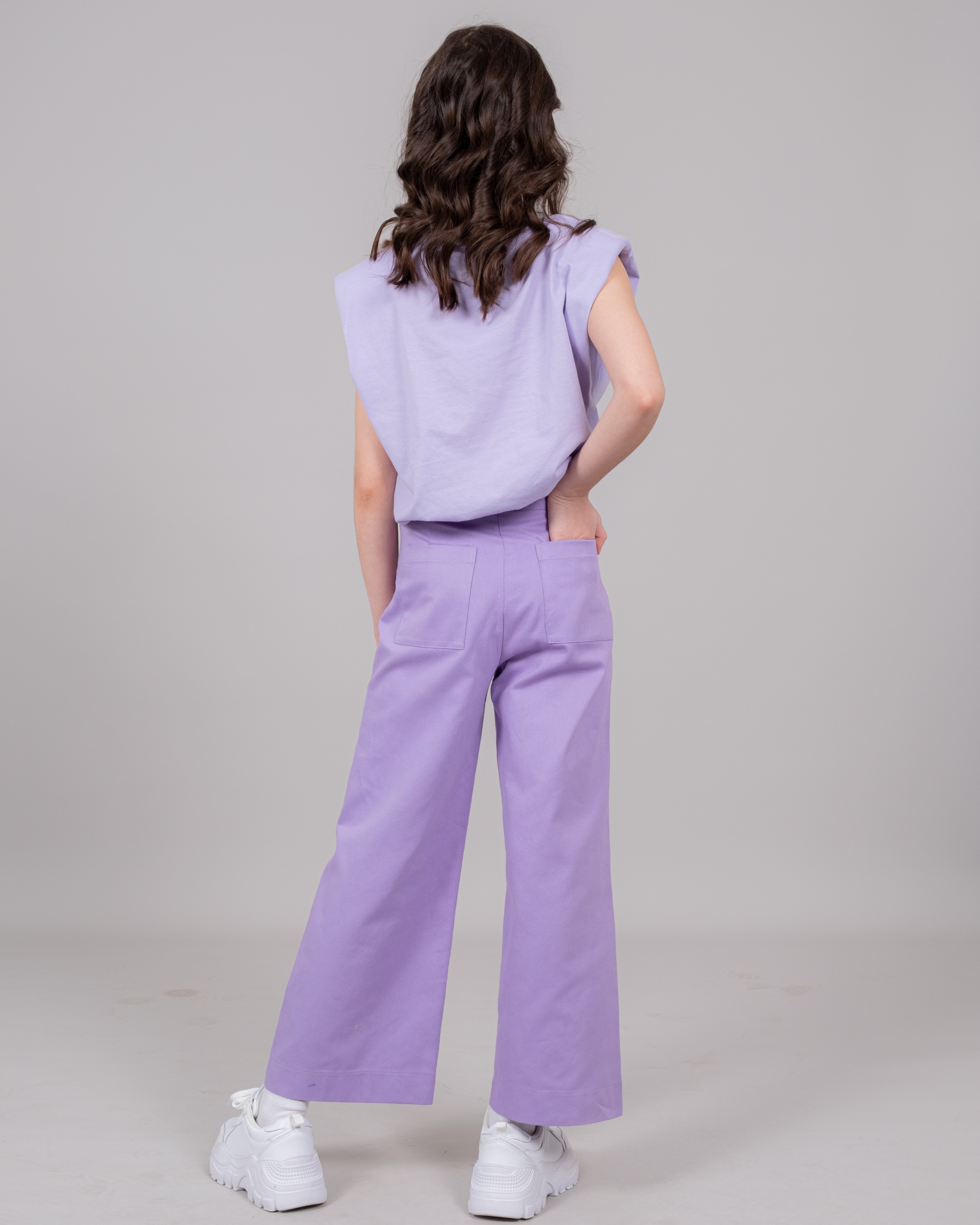 Палаццо - это свободные брюки с трендовой высокой посадкой. Брюки выполнены из хлопкового твила. Модель впишется в любой весенний и летний образы. Фасон позволяет сочетать джинсы с майками, топами, блузками и кардиганами.