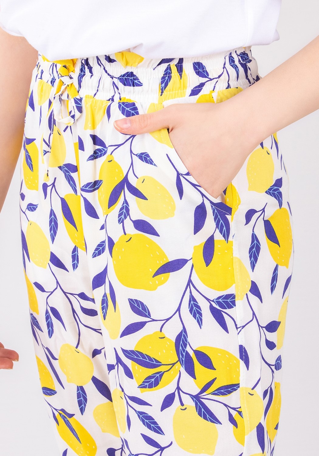 Прекрасный стильный костюм из двух предметов : футболки и брюк из легкого штапеля . Край рукава оформлен воланом. Брюки с боковыми карманами на манжетах. Яркий и актуальный костюм будет незаменимым нарядом в летний сезон.