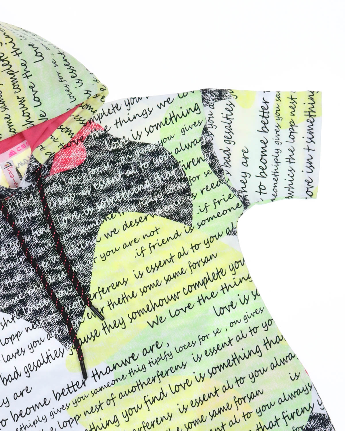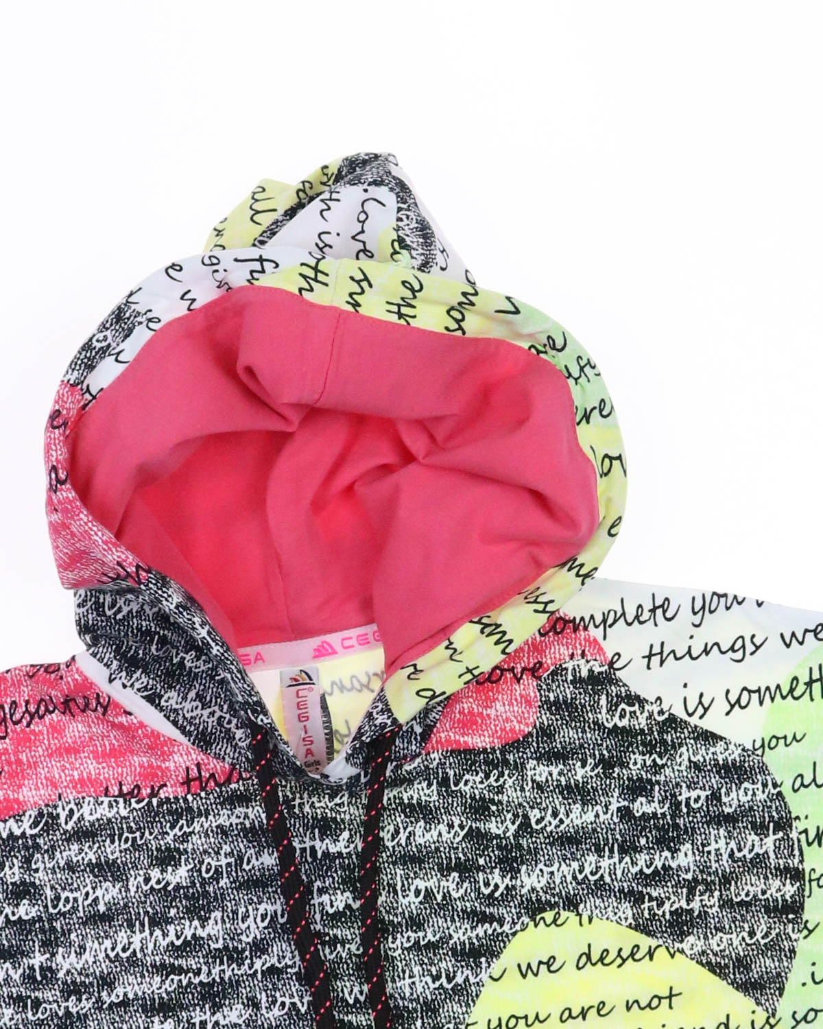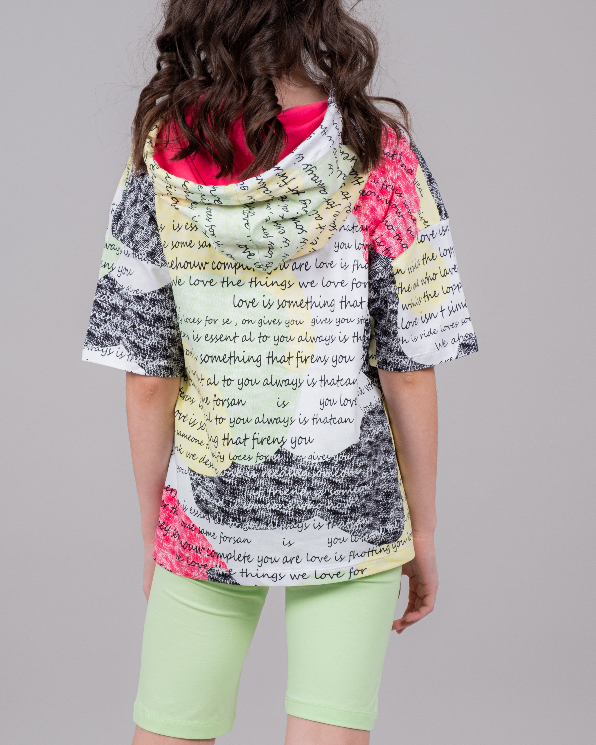 Летний костюм Cegisa для девочки оптом. Футболка с короткими рукавами, украшеная принтом и дополнена капюшоном со шнурком. Однотонные велосипедки облегающего кроя с поясом на резинке. Костюм изготовлен из хлопка с добавлением лайкры.