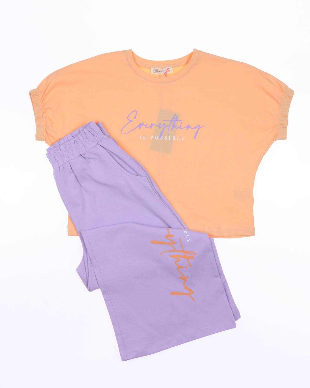 Стильный костюм Smile для девочки оптом. Укороченная футболка свободного кроя оформлена принтом. Рукава присборены резинкой. Широкие брюки с боковыми карманами и защипами на поясе создают модный образ. Костюм Smile для девочки оптом, выполнен из трикотажа кулирка.