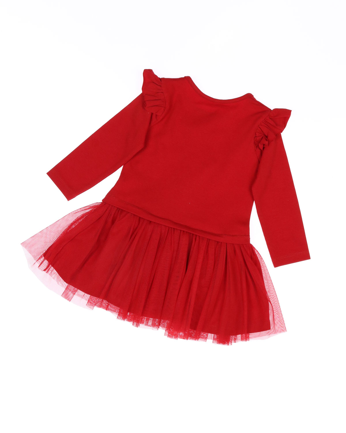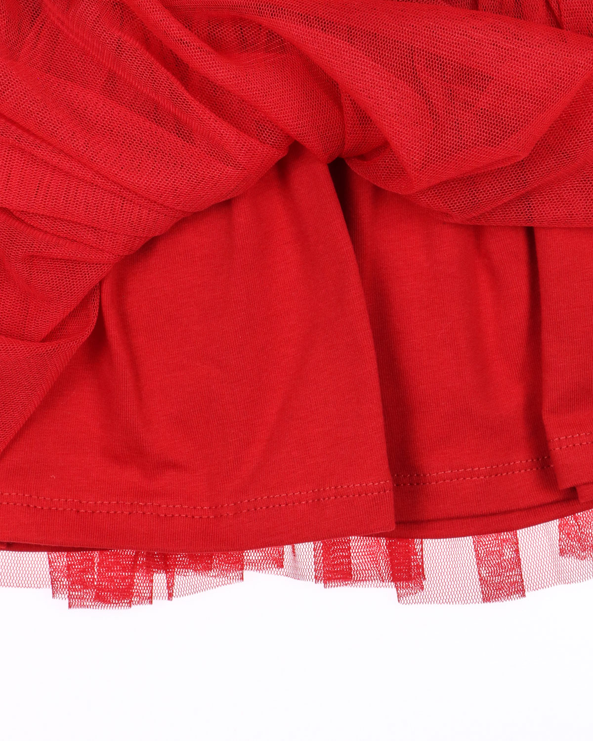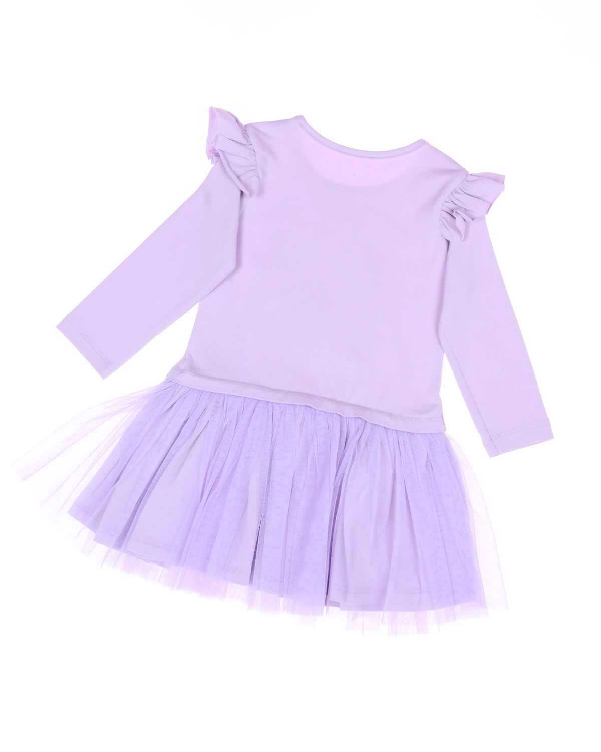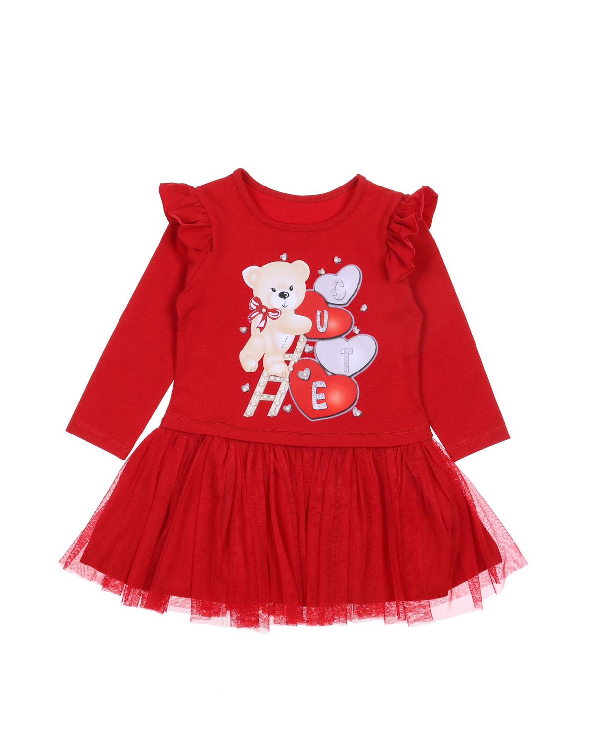Комбинированное платье для девочки оптом. Верхняя часть платья выполнена из кулирной глади, а юбка из мягкой сетки. На груди милый принт, который  украшен бусинами.