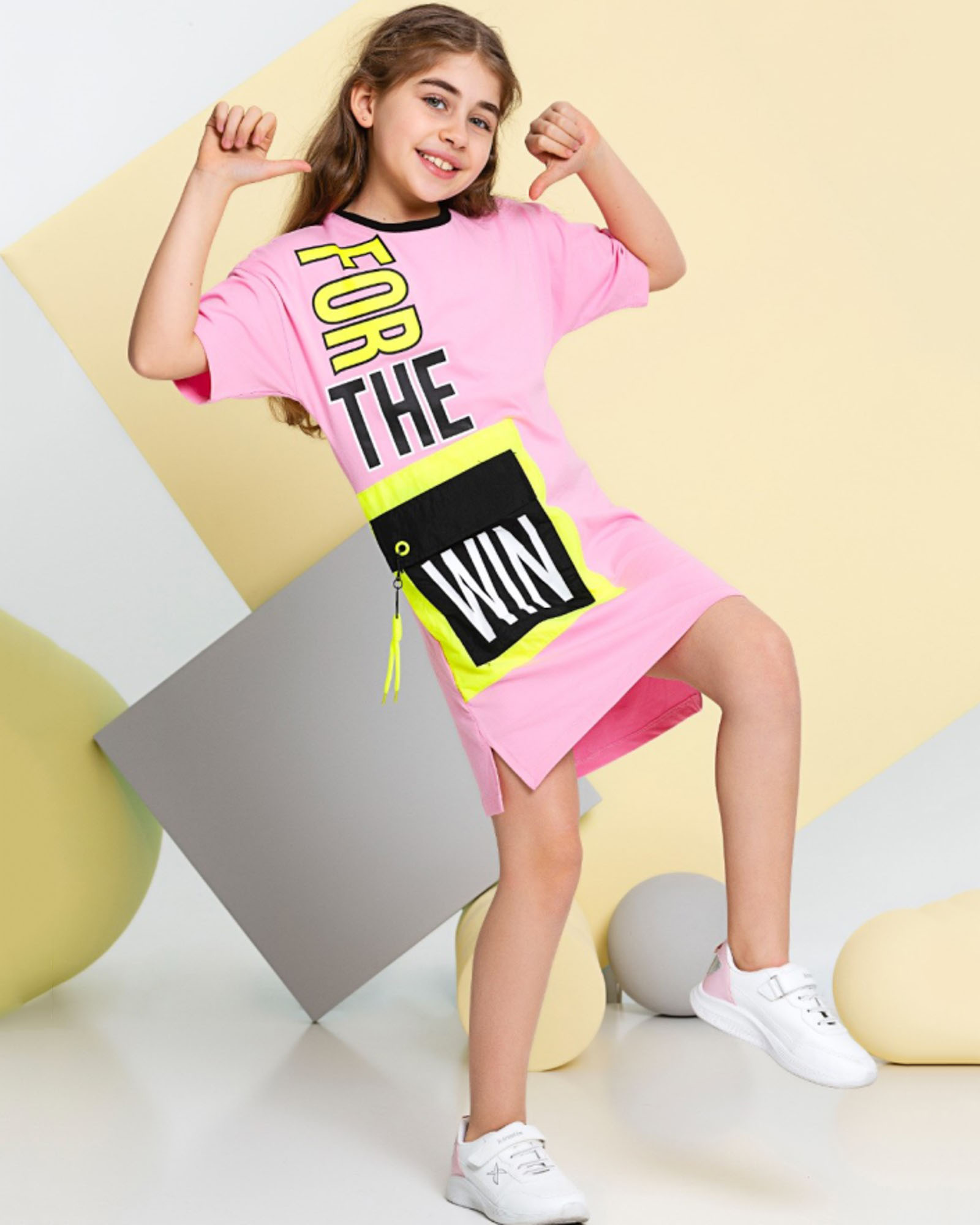 Стильное, необычное, очень комфортное для девочки, платье выглядит потрясающе. Оригинальный дизайн, построенный на модной форме и контрасте шрифтовой графики принта, подчеркивает остроту и оригинальность модели. Разрезы по бокам способствуют свободе движений девочки. Платье имеет модную длину до колена.