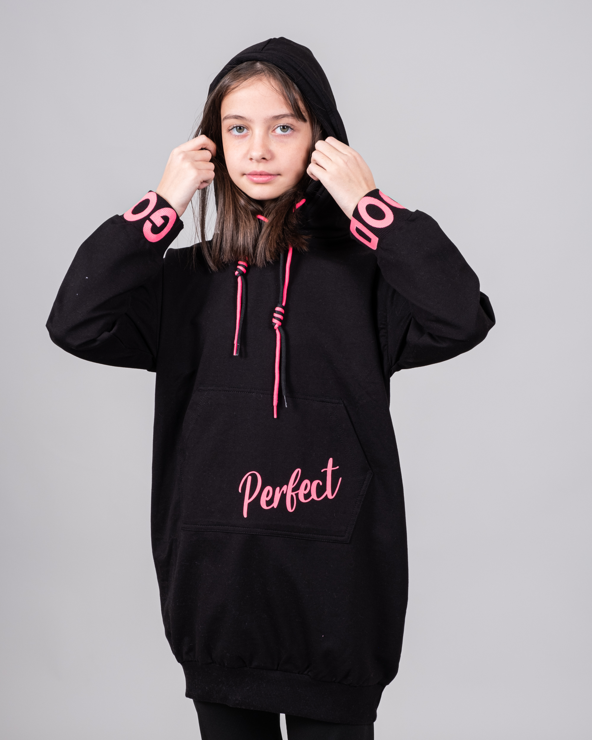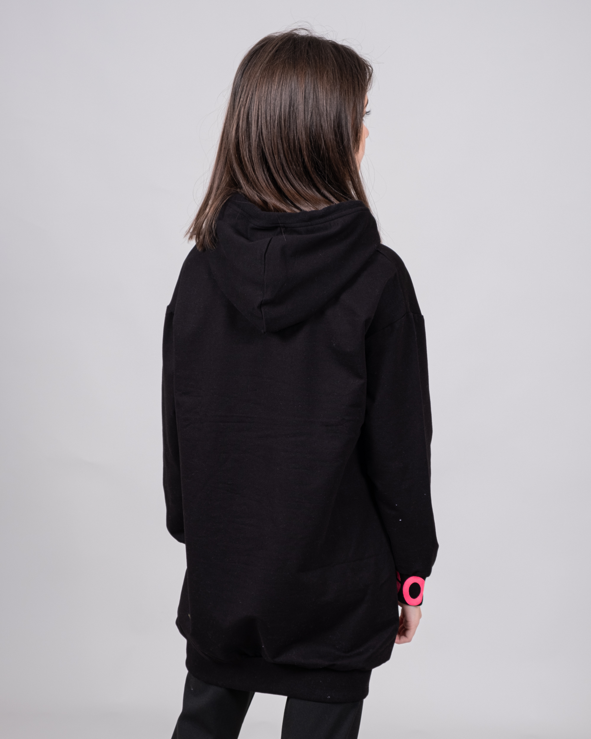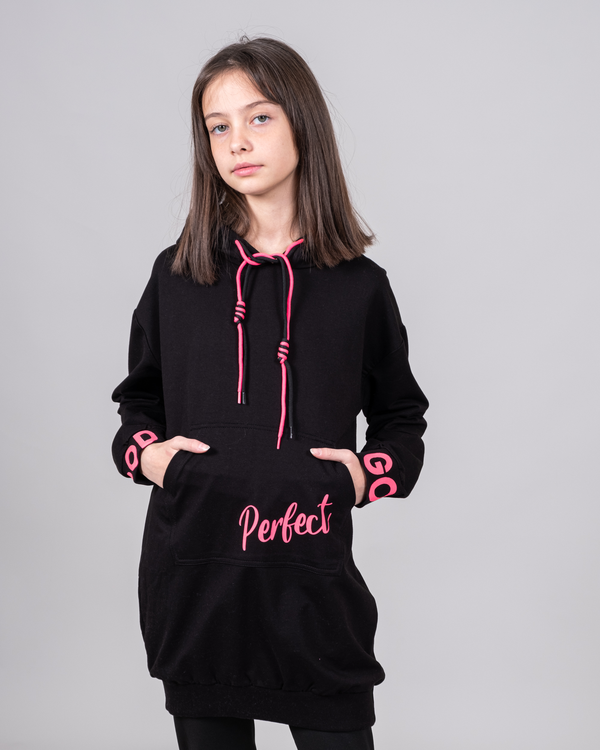 Удлиненное худи CEGISA  для девочки выполнено из качественного трикотажа футер (петля). Декорировано яркими шнурками и принтом.