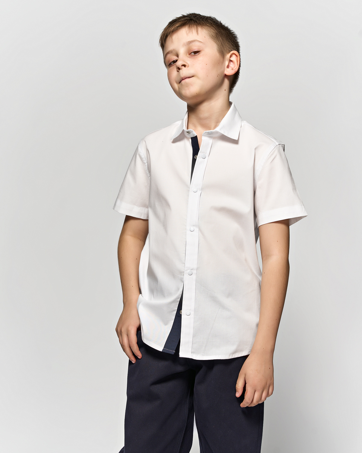 Рубашка Cegisa для мальчика оптом. Модель приталенного кроя с короткими рукавами, классическим отложным воротничком, застегивается на кнопки.