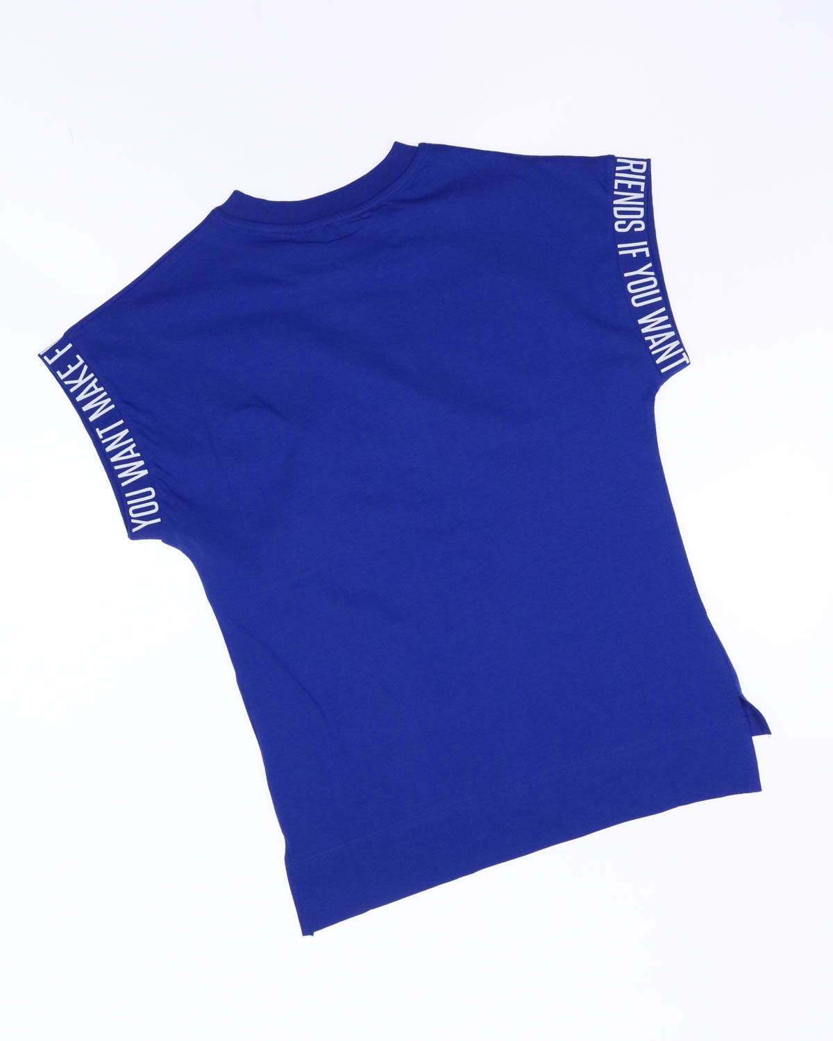 Футболка для мальчика свободного кроя со спущенной линией плеча. Рукава оформлены манжетами. Низ футболки ассиметричный с боковыми разрезами, на груди расположена фирменная эмблема.