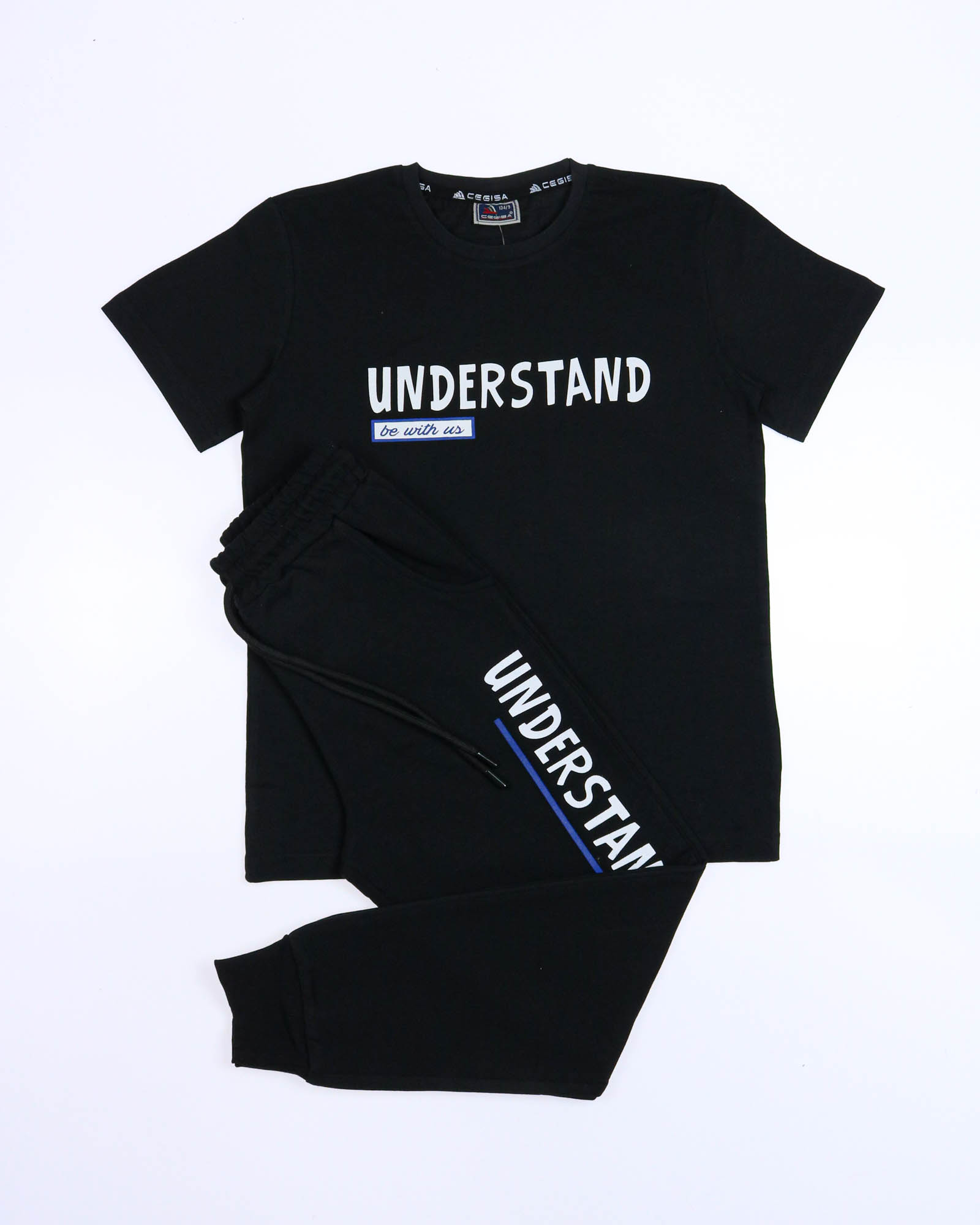 Трикотажный костюм CEGISA из хлопка оптом. Брюки выполнены из футера 2х нитки (петля) с карманами, на эластичном поясе с регулируемым шнурком и оригинальным принтом. Футболка выполнена из кулирной глади,прямого кроя с округлой горловиной, на груди стильный принт.