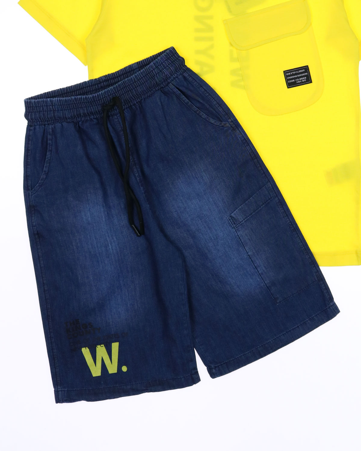 Костюм для мальчика DMB оптом. Футболка прямого кроя с короткими рукавами, на груди накладной карман. Бриджи из облегченной джинсы без эластана с боковыми карманами. Пояс на резинке с функциональным шнурком позволяет ругулировать объем на талии.