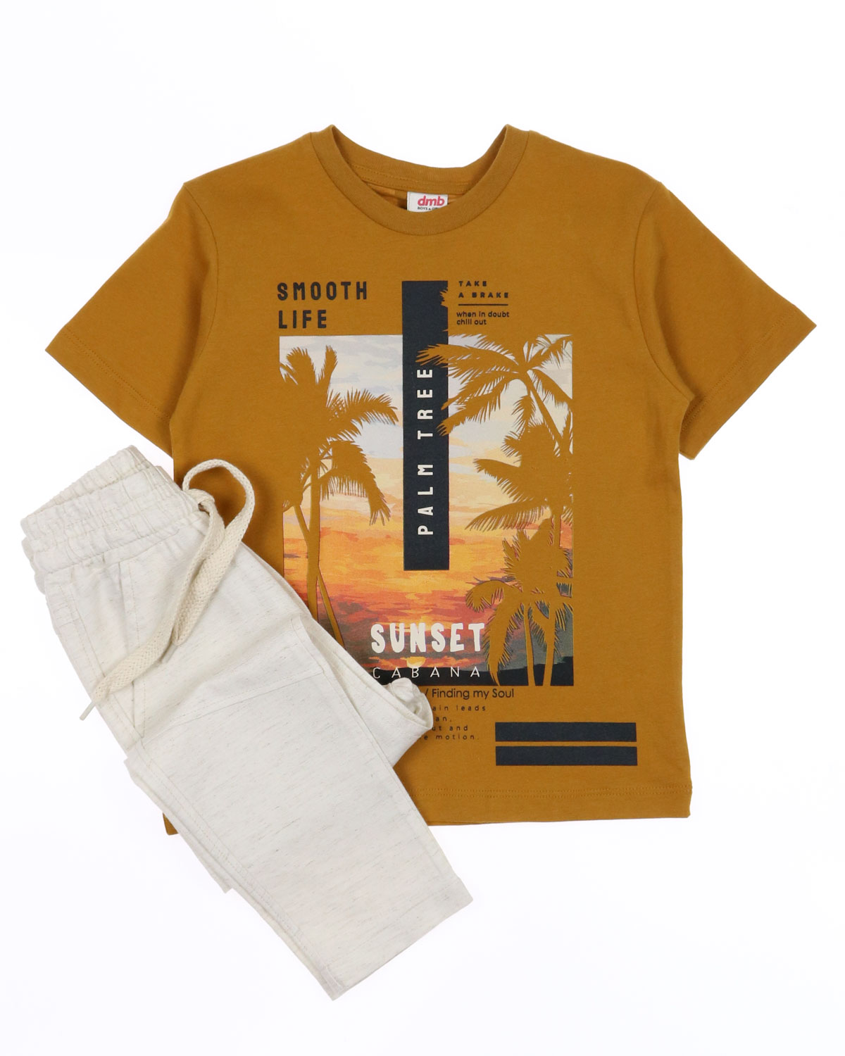 Летний костюм DMB для мальчика оптом. Футболка прямого кроя с короткими рукавами. Брюки легкие из хлопка без эластана с боковыми  карманами. Пояс на резинке с функциональным шнурком позволяет ругулировать посадку на талии, штанины зауженные без  манжетов.