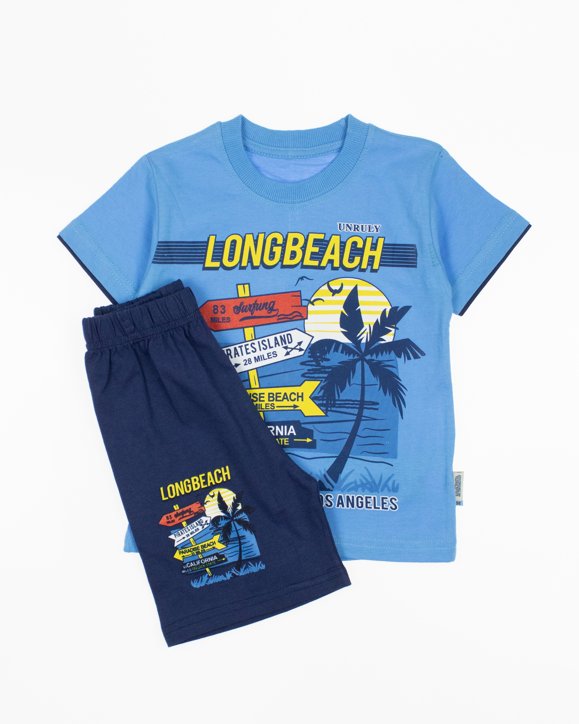 Костюм для мальчика Unruly оптом, состоит из футболки и шорт. Модель выполнена из хлопкового полотна и оформлена печатным принтом. Ткань кулирная гладь.