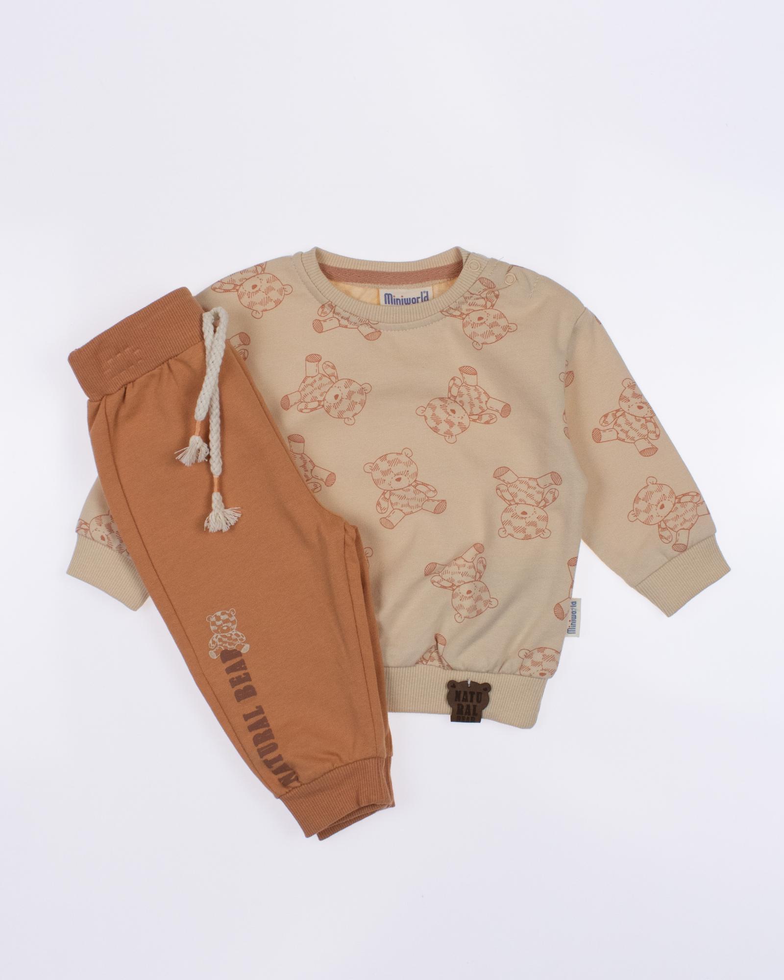 Мы предлагаем оптовые продажи детской одежды производства Турция. Хлопковый костюм  MINIWORLD выполнен из футера (петля), что гарантирует комфорт и безопасность для самых маленьких детей. Свитшот имеет удобную застежку-кнопки на плече, что облегчит процесс надевания и снятия одежды. Штанишки с мягкими манжетами на эластичном поясе идеально подходят для ношения с подгузником, обеспечивая свободу движений и комфорт. Детский милый принт на костюме поможет развить фантазию и воображение ребенка, делая его образ ярким и запоминающимся. Костюм MINIWORLD - отличный выбор для маленьких модников и их заботливых родителей. Не упустите возможность приобрести этот уникальный товар оптом по выгодной цене!