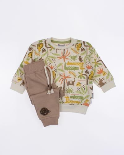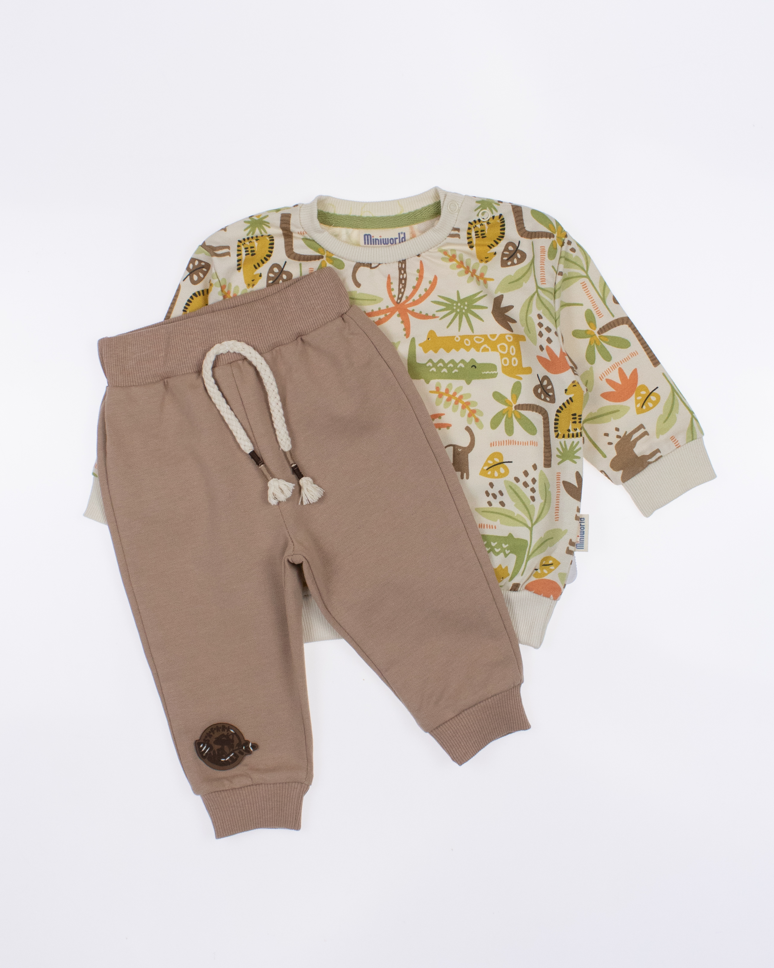 Мы предлагаем оптовые продажи детской одежды производства Турция. Хлопковый костюм  MINIWORLD выполнен из 100% хлопка, что гарантирует комфорт и безопасность для самых маленьких детей. Свитшот имеет удобную застежку-кнопки на плече, что облегчит процесс надевания и снятия одежды. Штанишки с мягкими манжетами на эластичном поясе идеально подходят для ношения с подгузником, обеспечивая свободу движений и комфорт. Детский милый принт на костюме поможет развить фантазию и воображение ребенка, делая его образ ярким и запоминающимся. Костюм MINIWORLD - отличный выбор для маленьких модников и их заботливых родителей. Не упустите возможность приобрести этот уникальный товар оптом по выгодной цене!